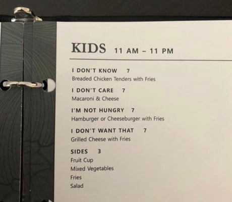 Perfect kids menu July 31, 2018 from 9GAG - Fresh - No Gif https://ift.tt/2M4chAq Share Get link Facebook X Pinterest Email Other Apps Labels 9GAG - Fresh - No Gif Share Get link Facebook X Pinterest Email Other Apps Comments