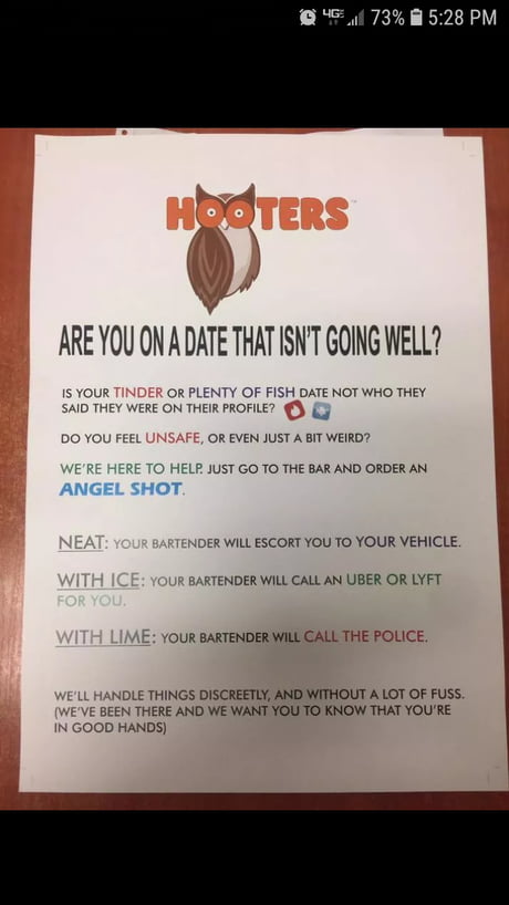 Hooters has a secret code for sketchy dates. February 28, 2019 from 9GAG - Hot - No Gif https://ift.tt/2H2PsgO Share Get link Facebook X Pinterest Email Other Apps Labels 9GAG - Hot - No Gif Share Get link Facebook X Pinterest Email Other Apps Comments